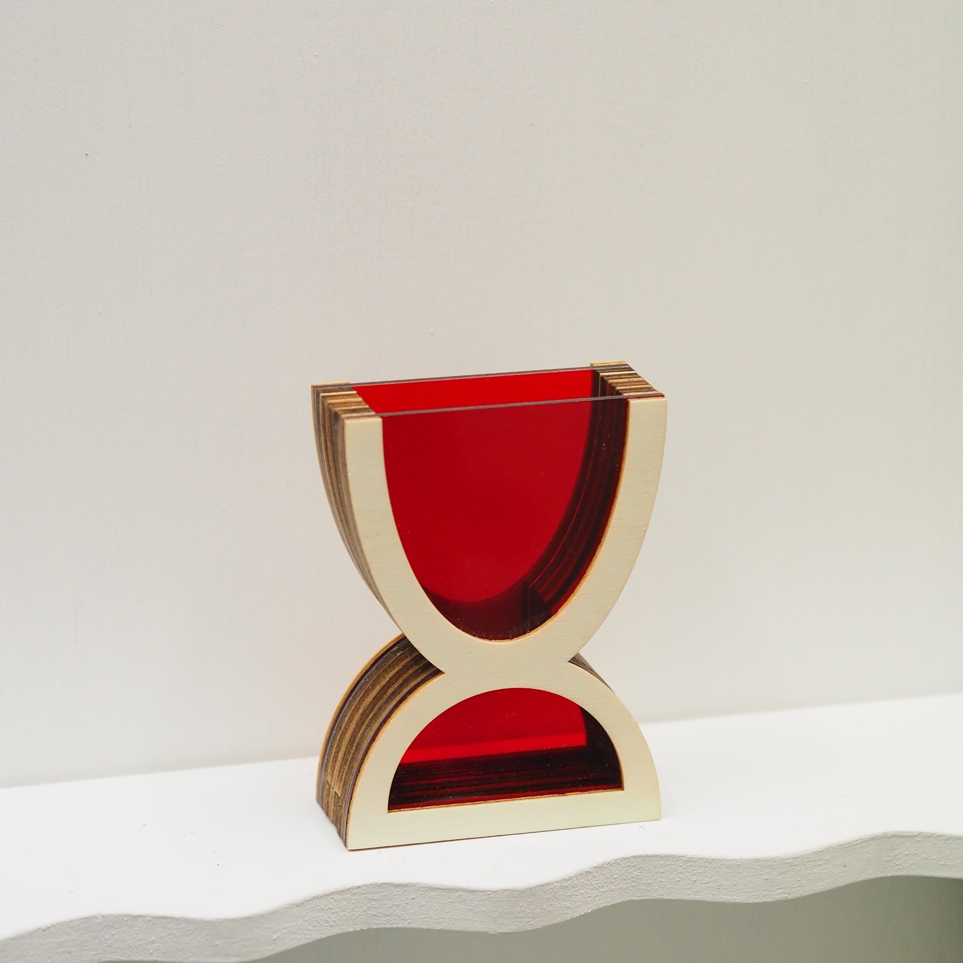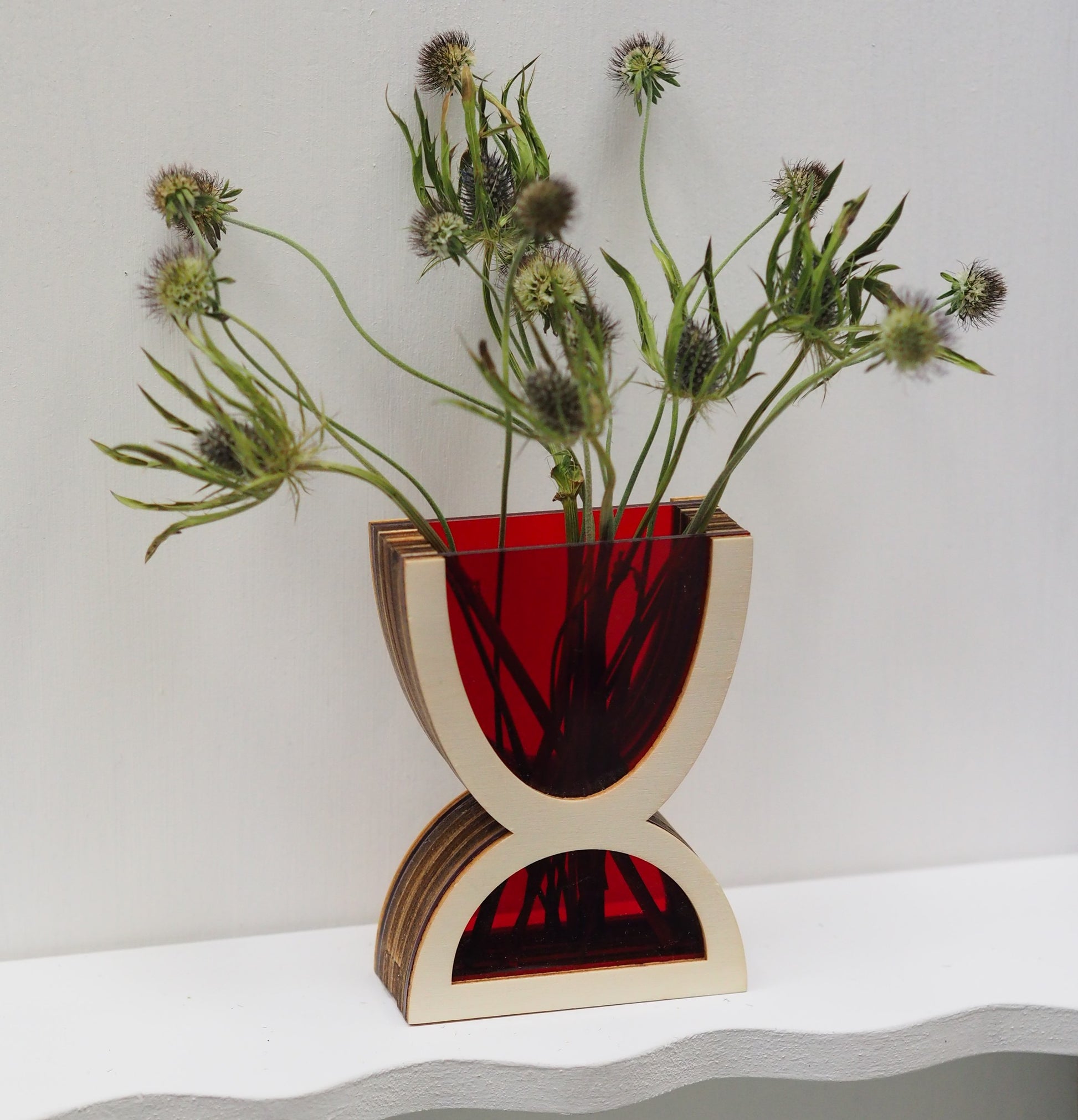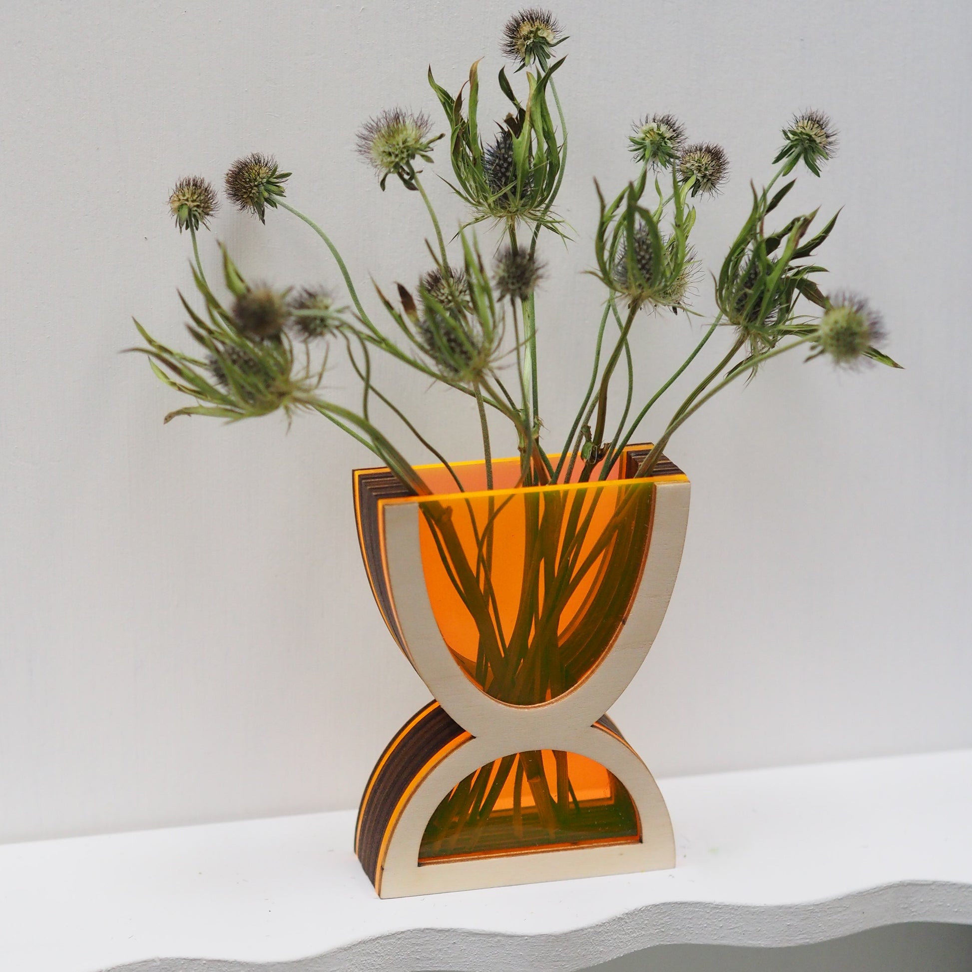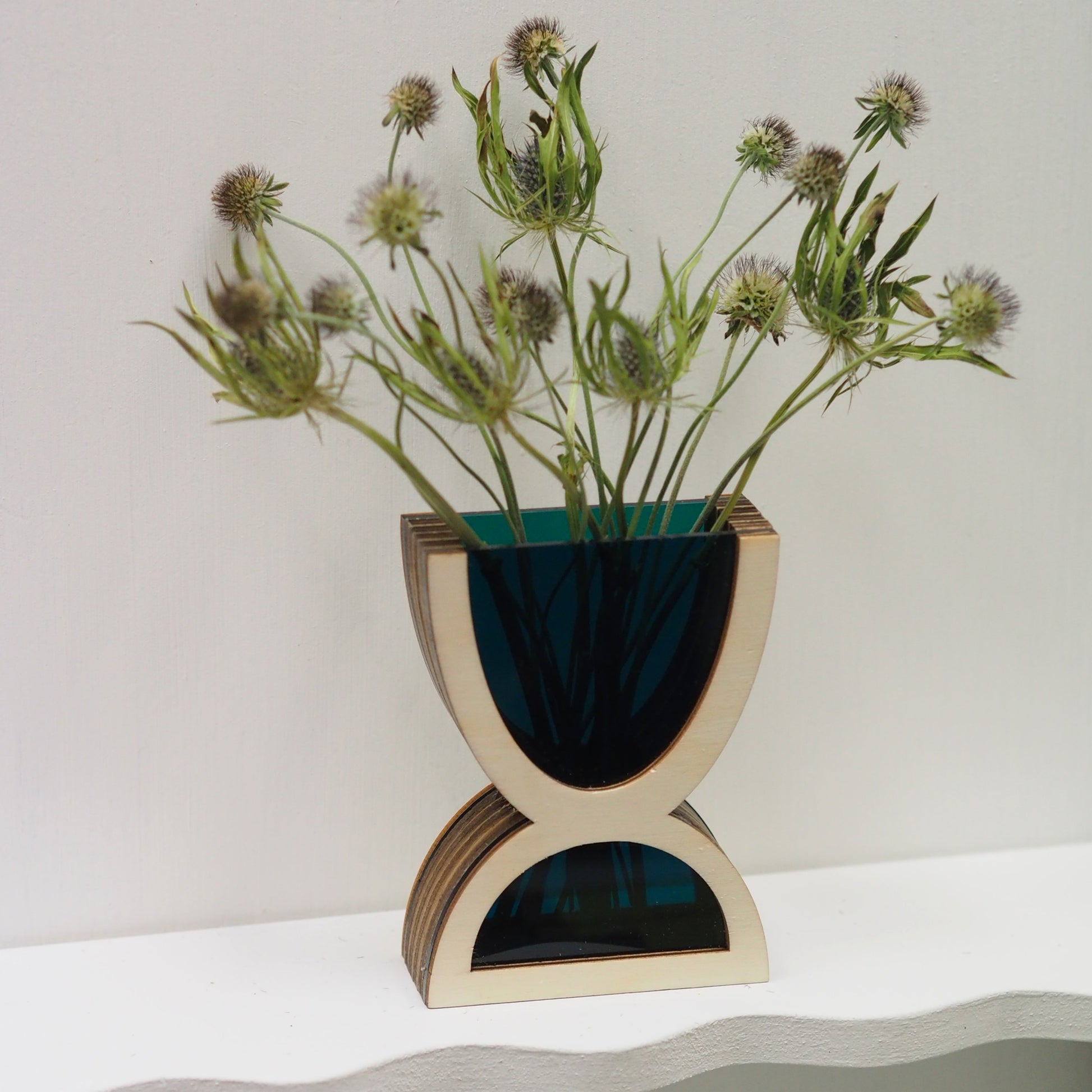 Each vase is made from layers of plywood, laminated by hand with acrylic sheets to create a playful, graphic mid-century inspired look.
