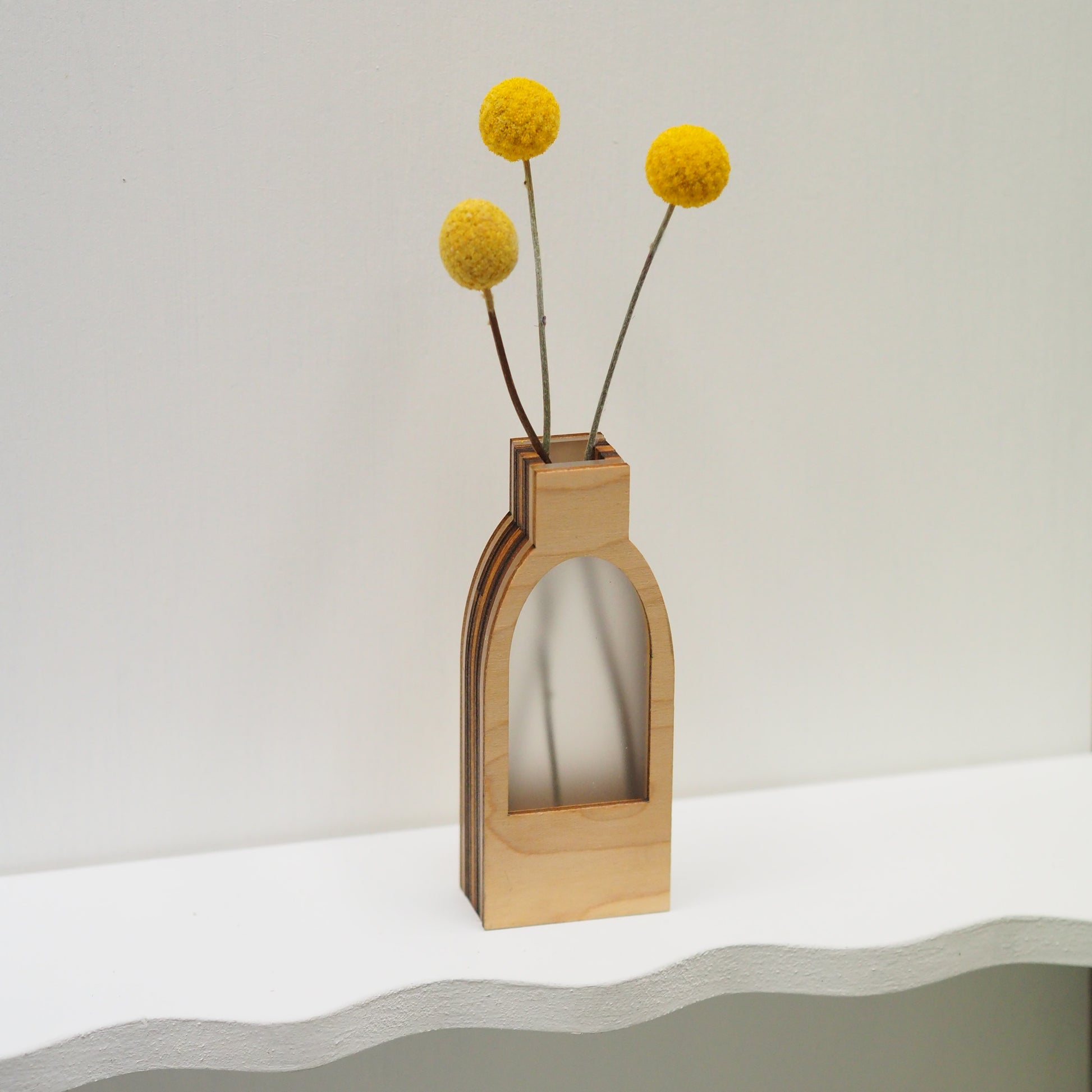 Each vase is made from layers of plywood, laminated by hand with acrylic sheets to create a playful, graphic mid-century inspired look.