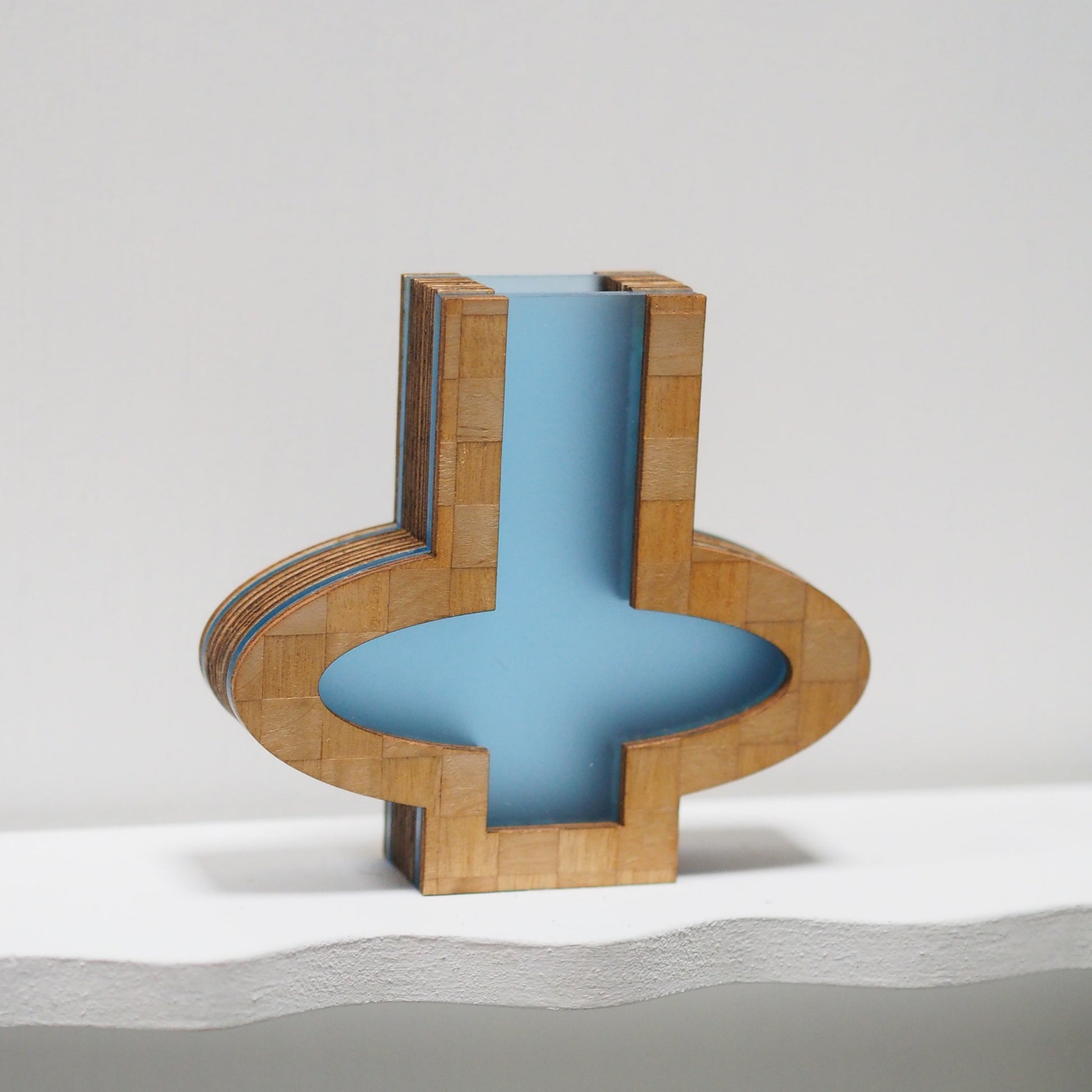 Each vase is made from layers of plywood, laminated by hand with acrylic sheets to create a playful, graphic mid-century inspired look.