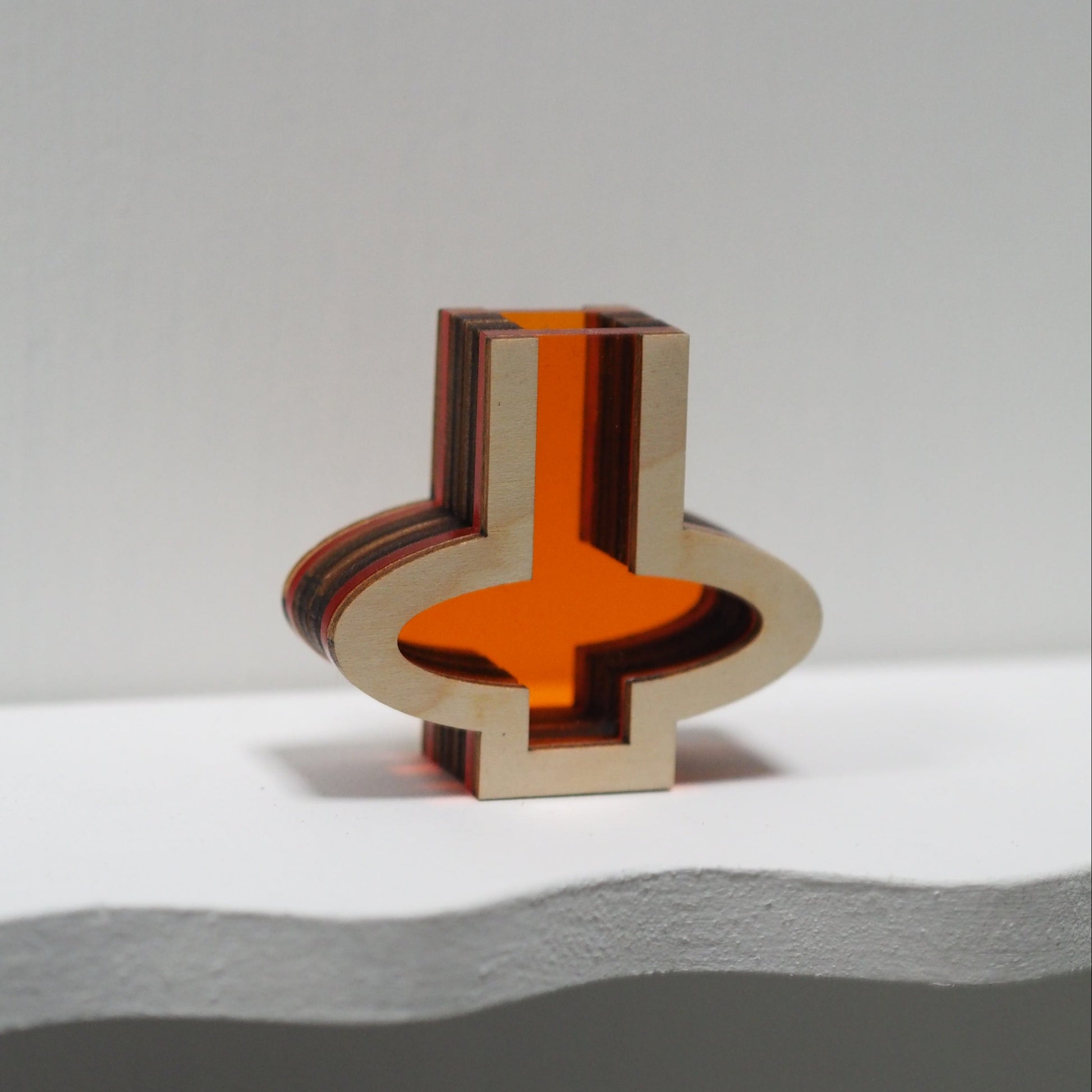 Each vase is made from layers of plywood, laminated by hand with acrylic sheets to create a playful, graphic mid-century inspired look.